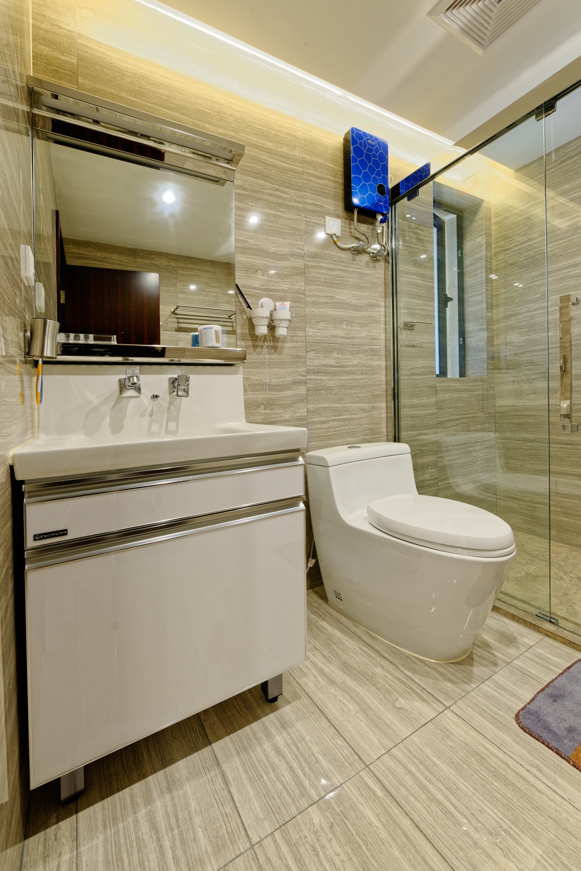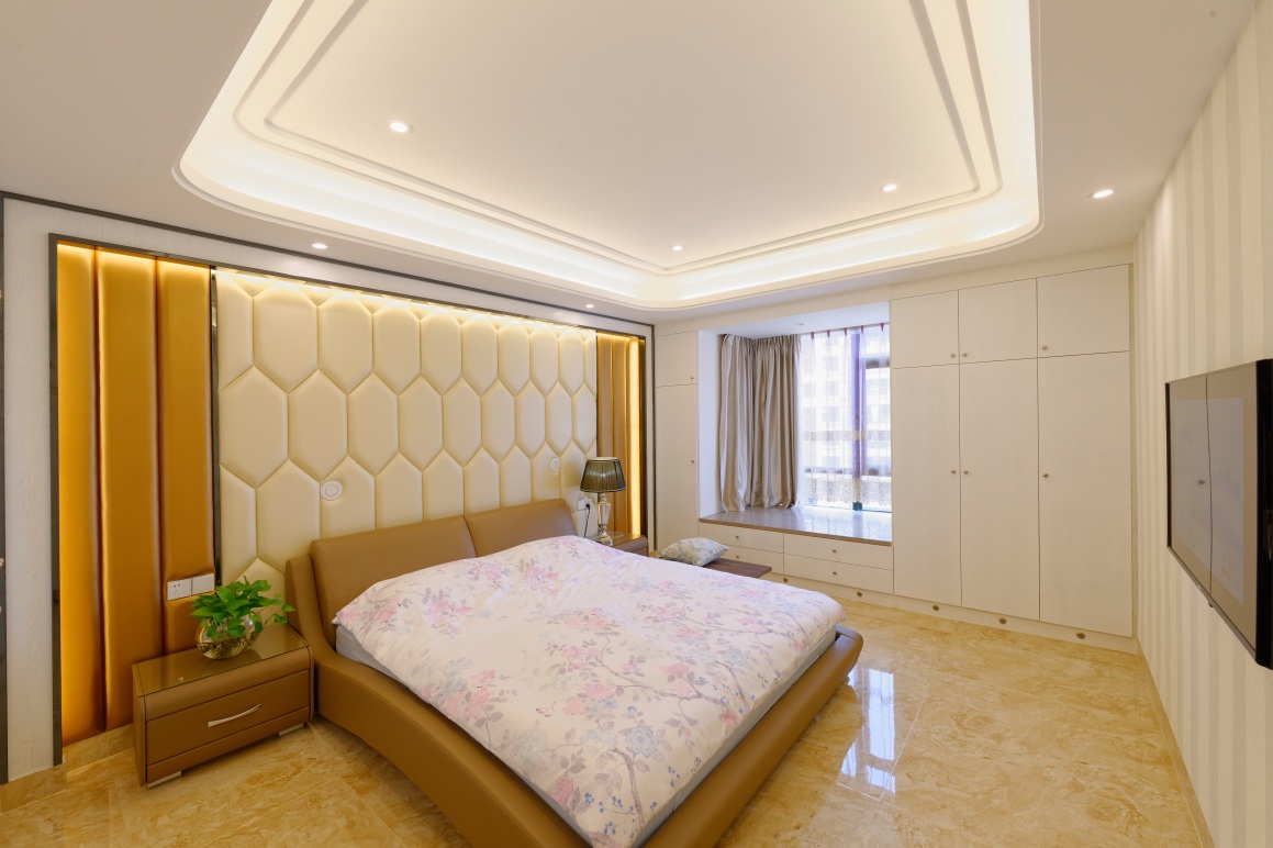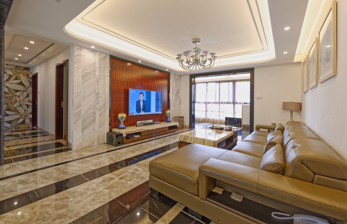 本案大量采用當(dāng)代簡約元素,精致的沙發(fā)、皮革、馬賽克、玻璃、進(jìn)口板材、水晶燈、每個(gè)空間不復(fù)雜,現(xiàn)代元素。