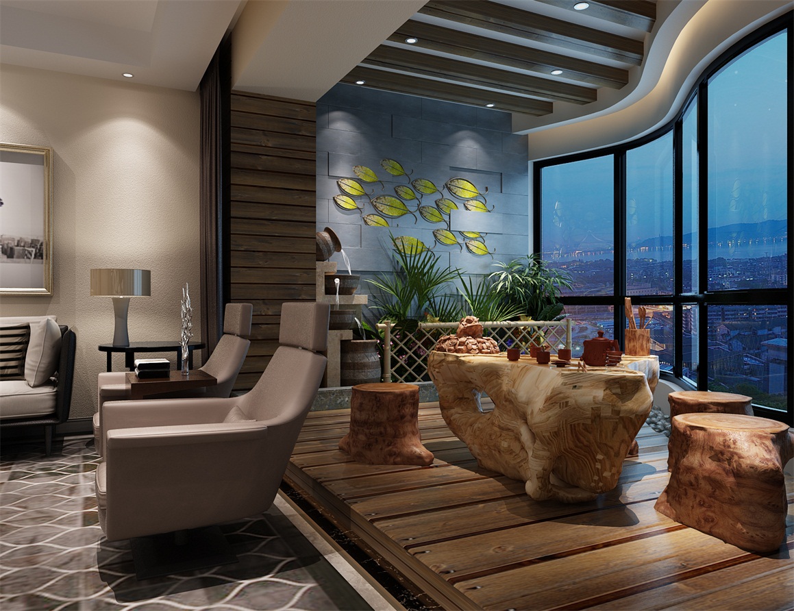本案作為客戶的度假用房,更多的考慮是大氣休閑,休閑的江景茶臺,高級的影音系統,觀景大餐廳,讓業(yè)主享受愉快的度假時光