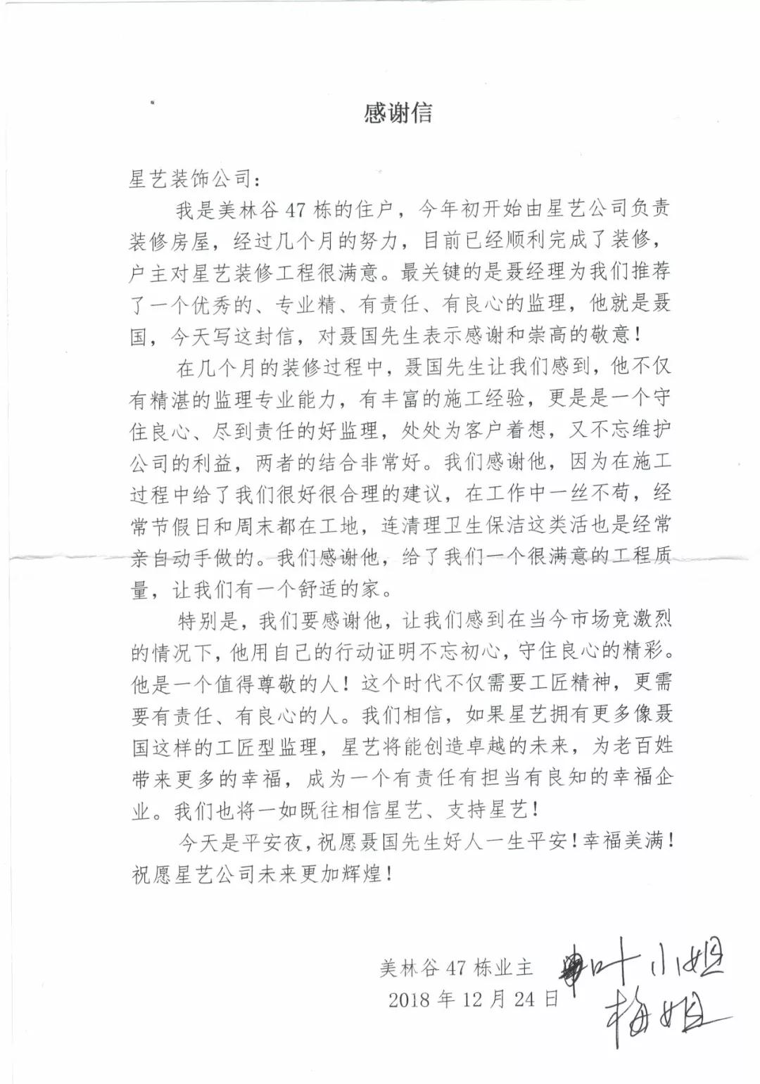 在此非常感謝美林谷客戶送來的錦旗及感謝信,這是對星藝人工作的極大認(rèn)可和肯定。今后我們將繼續(xù)把客戶的家當(dāng)成自己的家來裝飾,努力實現(xiàn)對客戶的承諾“把裝修交給我們,您放心上班去”。 以匠人精神,用心設(shè)計幸福,打造能夠傳遞和諧、滋生幸福、綠色環(huán)保的生活空間,為星藝贏得更多的贊譽(yù)和尊重。