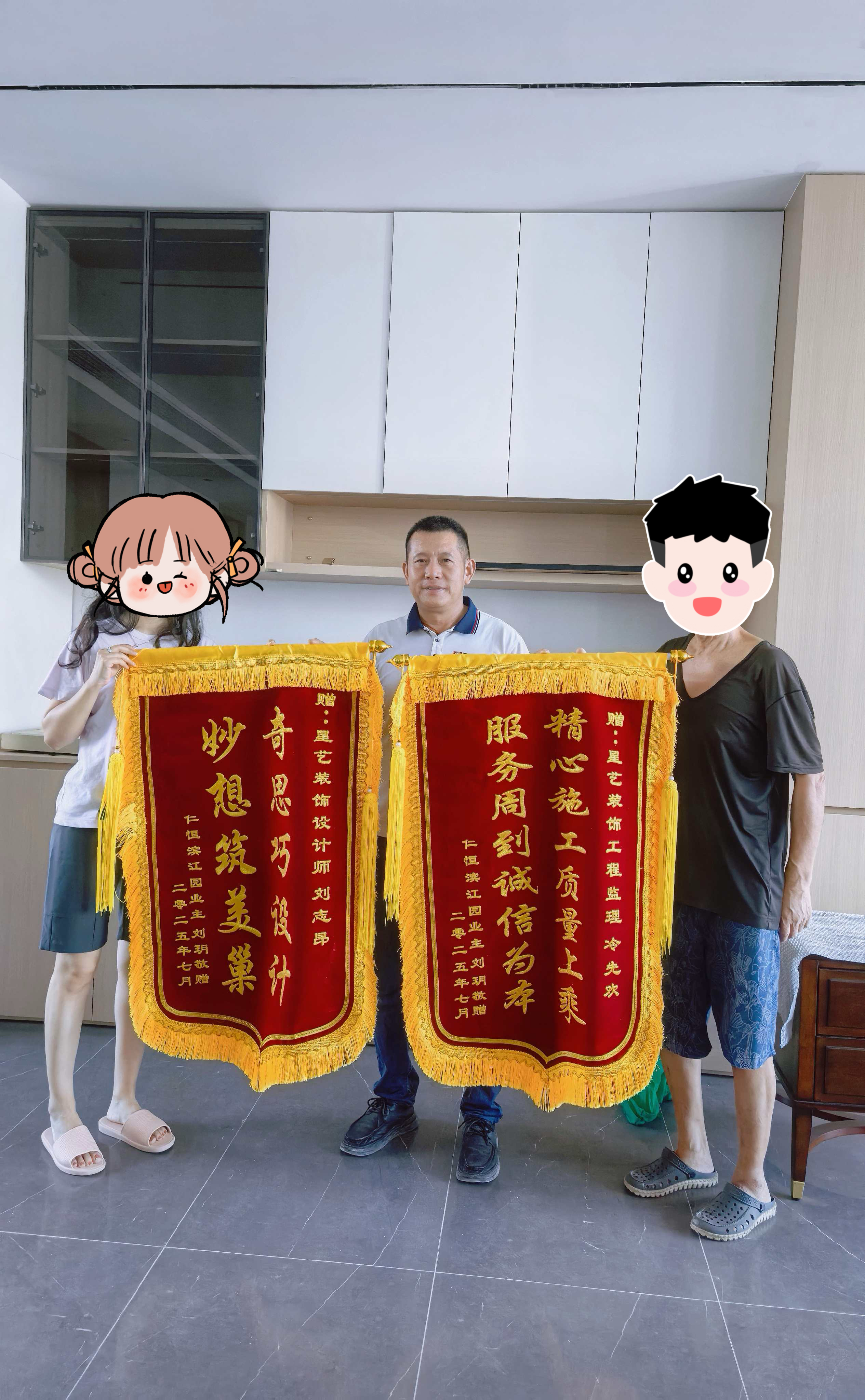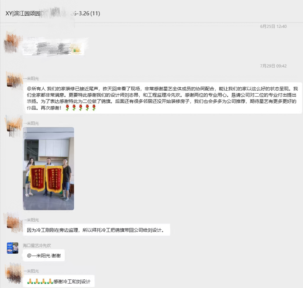 非常感謝星藝全體成員的協(xié)同配合,能讓我們的家以這么好的狀態(tài)呈現(xiàn),我們?nèi)叶挤浅M意。更要特此感謝我們的設(shè)計師劉志昂,和工程監(jiān)理冷先歡,感謝兩位的專業(yè)用心。懇請公司對二位的專業(yè)付出提出表揚。為了表達(dá)感謝特此為二位做了錦旗。后面還有很多鄰居還沒開始裝修房子,我們也會多多為公司推薦,期待星藝有更多更好的作品。再次感謝!