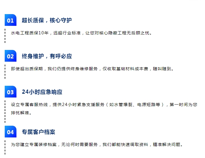 星藝裝飾認(rèn)為,真正的服務(wù),沒有終點(diǎn)。我們提出:“水電質(zhì)保10年,終身維護(hù)及24小時(shí)應(yīng)急響應(yīng)”。我們不僅是裝修者,更是您家庭設(shè)施的終身守護(hù)者。