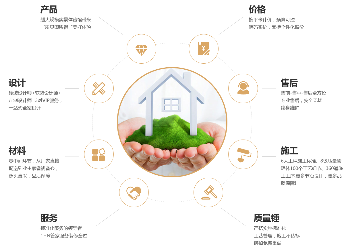 設(shè)計(jì) + 主材 + 輔材 + 水電 + 施工 + 定制 + 安裝